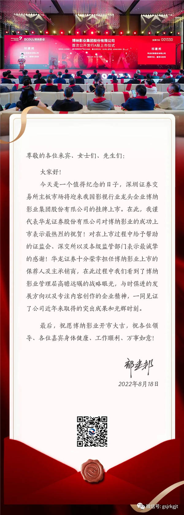 黨委書記、董事長祁建邦向博納影業(yè)首次公開發(fā)行A股上市致賀詞