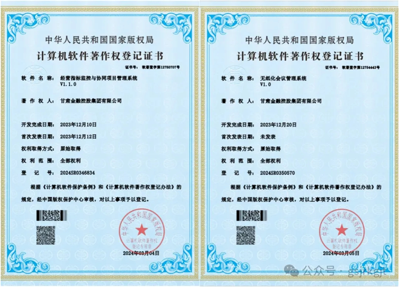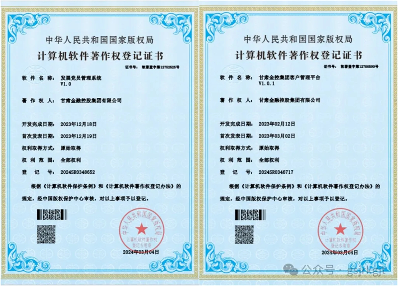 甘肅金控集團喜獲四項軟件著作權證書