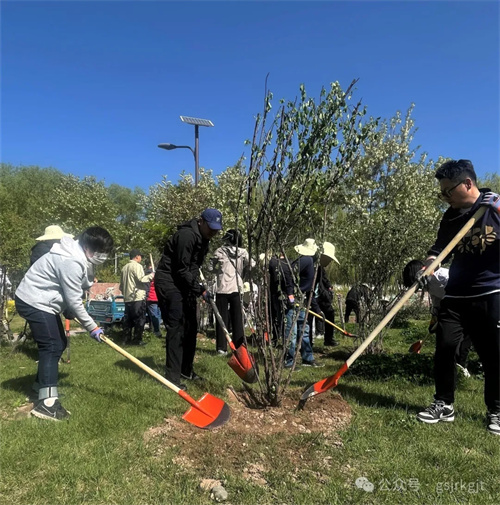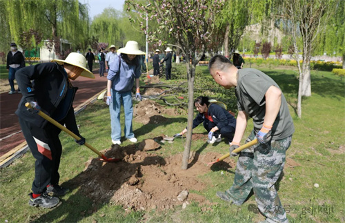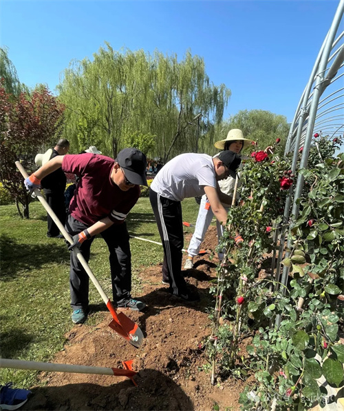 活動當日晴空萬里,在公園專業(yè)技術人員指導下,集團領導率先垂范,與干部職工“并肩奮戰(zhàn)”,大家分工明確、協(xié)作有序,共同栽種海棠、榆葉梅、碧桃等觀賞樹木和牡丹、月季、繡球等花卉,為黃河之畔再添新綠。泥土芬芳中,鐵鍬與笑語和鳴成曲,青年團員們自發(fā)組成“搬運苗木小分隊”穿梭奔忙保障供給;部分女職工組成“殺菌沃土先鋒組”,精準投放藥劑為土壤消毒;由青年黨員組成的“喬木攻堅團” 更是勇挑重擔,主動承擔種植冠幅大、重量重的海棠、碧桃等喬木的任務,喊著口號扶正碗口粗的樹干,覆土時反復校準樹干垂直度,各小組默契配合,現場一片熱火朝天。隨著“種植先鋒隊”完成最后一株月季栽種,歷時三小時的連續(xù)奮戰(zhàn),295株新苗在公園內指定規(guī)劃區(qū)域內安家落戶,形成“春觀海棠、夏賞繡球、丁香獨秀、月季連廊”豐富的景觀帶。