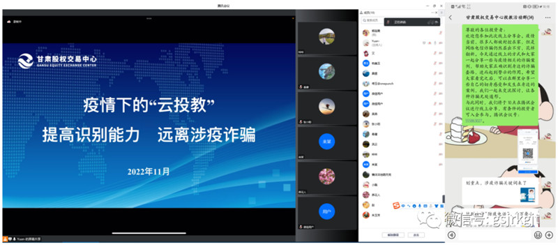 網(wǎng)絡(luò)時(shí)代給我們的生活帶來(lái)了極大的便利,但多數(shù)大齡投資者接受與使用網(wǎng)絡(luò)工具的程度較低,風(fēng)險(xiǎn)識(shí)別能力不足,甘肅股權(quán)交易中心按照合格投資者年齡結(jié)構(gòu)及使用偏好通過微信、騰訊會(huì)議等線上交流方式,組織投資者觀看涉疫詐騙視頻及案例。
