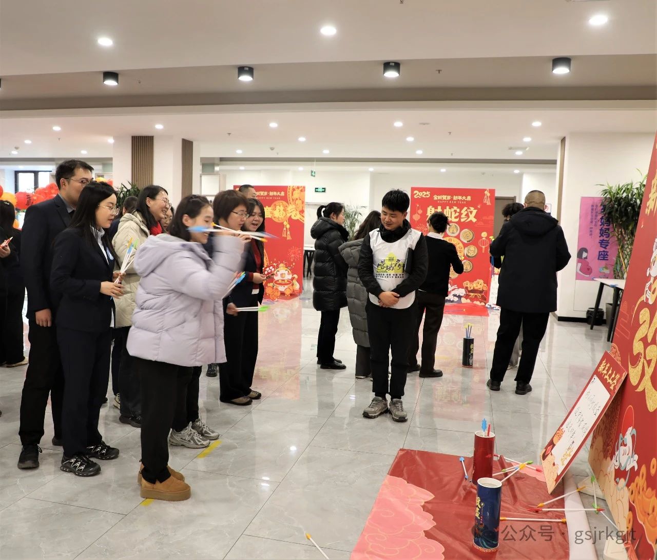 隨著鏗鏘有力的鑼鼓聲,兩只威武靈動的“祥瑞金獅”躍入會場,拉開活動序幕,在舞獅隊(duì)員輾轉(zhuǎn)騰挪間,集團(tuán)公司領(lǐng)導(dǎo)執(zhí)筆點(diǎn)睛,寓意新年開新局。隨后開展的“古韻新潮”游戲區(qū)人聲鼎沸,投壺游戲中的“上上簽”破空聲與歡呼聲此起彼伏,“射箭”靶場選手凝神靜氣“百步穿楊”,“釣魚”現(xiàn)場錦鱗翻飛笑鬧如潮,套圈環(huán)節(jié)精準(zhǔn)拋擲歡呼雀躍,冰壺賽道上更是上演“智謀對決”,團(tuán)隊(duì)協(xié)作的默契充分展現(xiàn)。現(xiàn)場氣氛熱烈,歡笑與掌聲交織出歡樂的海洋。
