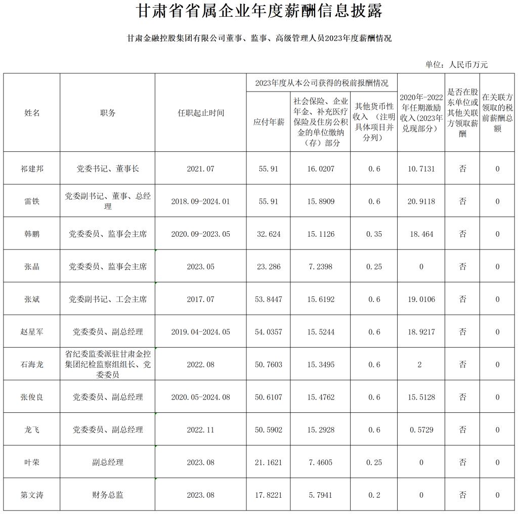 甘肅金融控股集團有限公司董事、監(jiān)事、高級管理人員2023年度薪酬情況